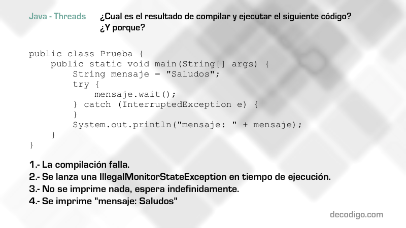 Tip: Causa que el thread en curso espere hasta que otro thread invoque el método notify() o el método notifyAll(). El método wait debe estar contenido en un bloque un bloque synchronized(this){}.
